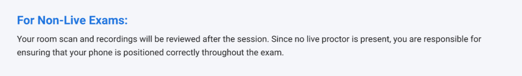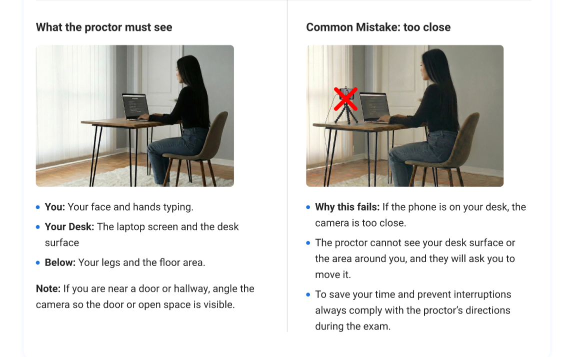 ⚠️ Important: If your phone disconnects during the exam, the proctor will be forced to pause your session. Please make sure it is plugged into a power source.