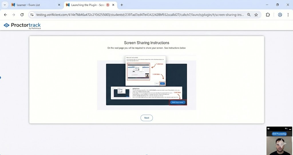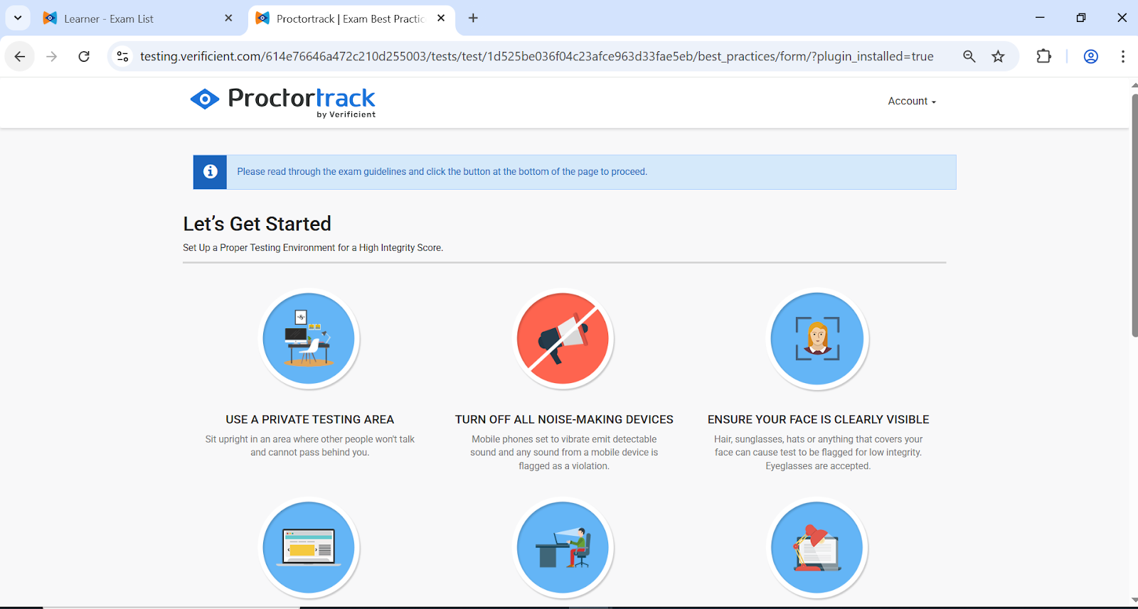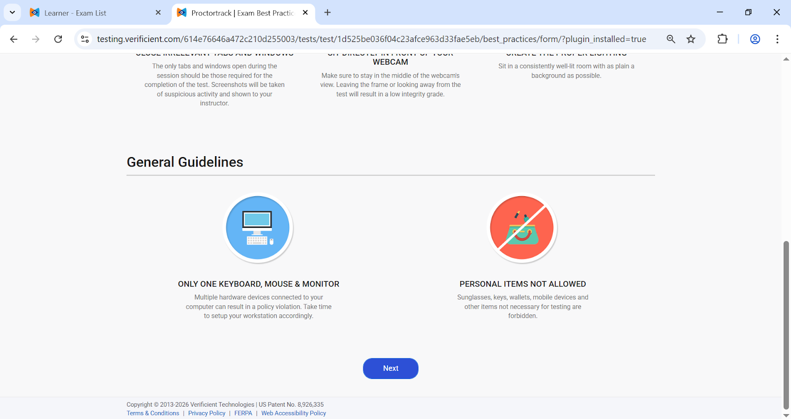 Review Guidelines: Read the "Let's Get Started" screen. Ensure your face is visible, audio devices are off, and you are using a single monitor. Click Next.
