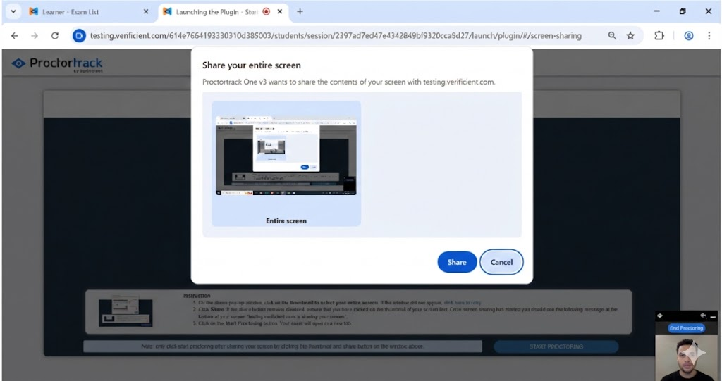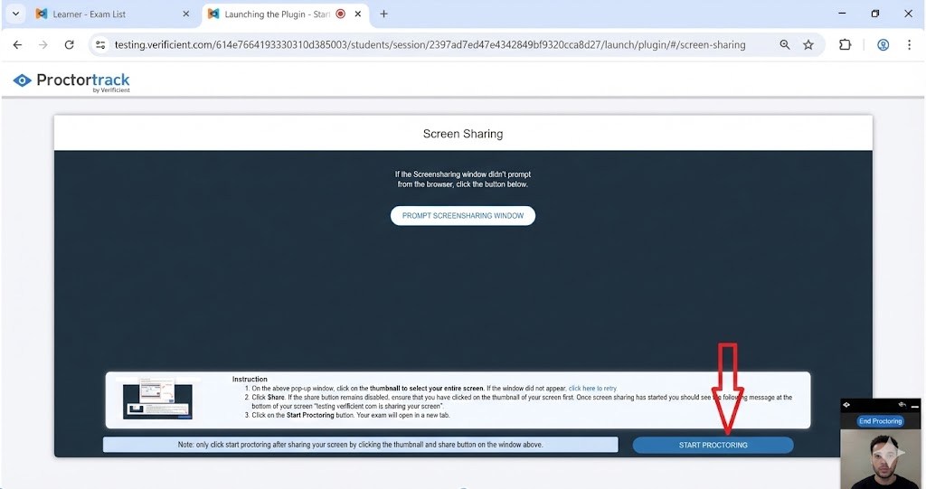 Once screen sharing is active, the exam setup is complete. Click Start Proctoring to open your exam.